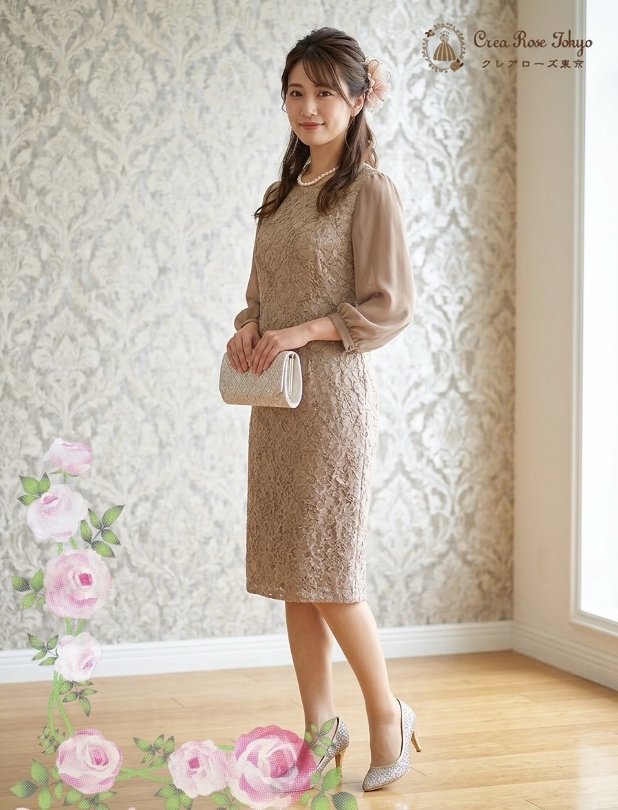 ゲストドレス横浜、落ち着いた印象のベージュドレス【ルシアーノベージュドレス】程よいボリュームの袖が動きをエレガントに 結婚式に参列するご親族やミセスのパーティーに