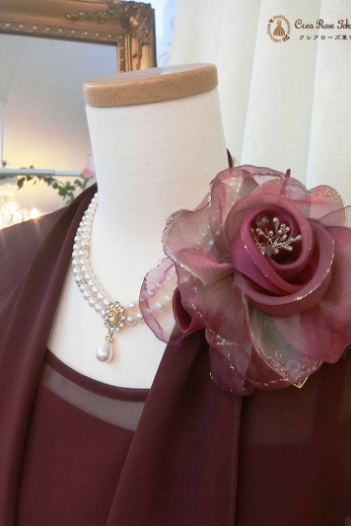 お祝いに華を添えるコサージュは、ドレスやお母様を引き立てる重要な小道具です。ただし非常に繊細で取り扱いに気を遣うため、一般的なレンタルドレス店ではほとんど扱っていません(当店では日本のメーカーが1点1点手作りしたコサージュをご用意しています)。
