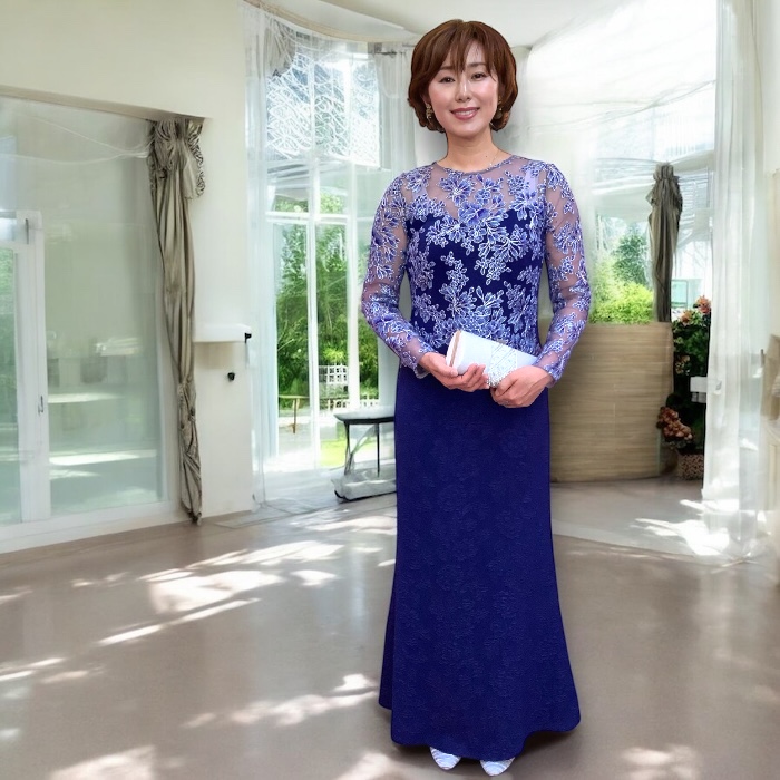 一枚でさらりと着こなせ、ネイビーよりも軽く、爽やかな印象を与えるドレスは、1年を通して華やかなドレスとして着用していただけますが、春から夏の正礼装として特にお勧めの一着です。婚礼の新郎新婦のお母様に最適です。